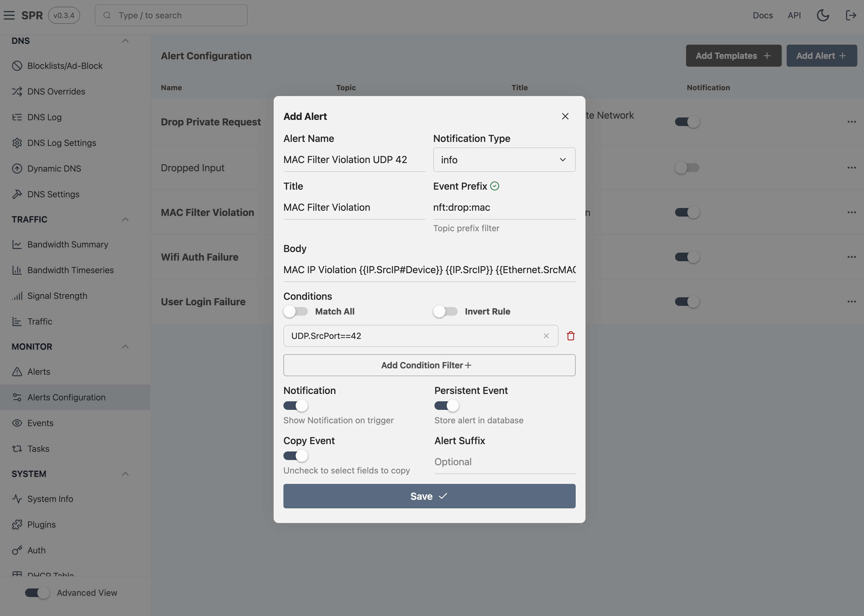 Alerts can Notify in the UI or they can sit on the Alerts page for triaging. When defining an alert, users can fill out the 'Title' and 'Body' for the alert to display. These support a templating language, for populating text with fields from the Alert Event. Furthermore, we've added a few decorators with hashtags to convert identifiers to device icons or go from something like a MAC address to a device name or IP Address.